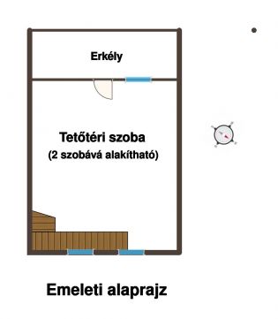 A brutto 28.6 m2-es, egylégterű emeleti rész szintén két szobává alakítható.